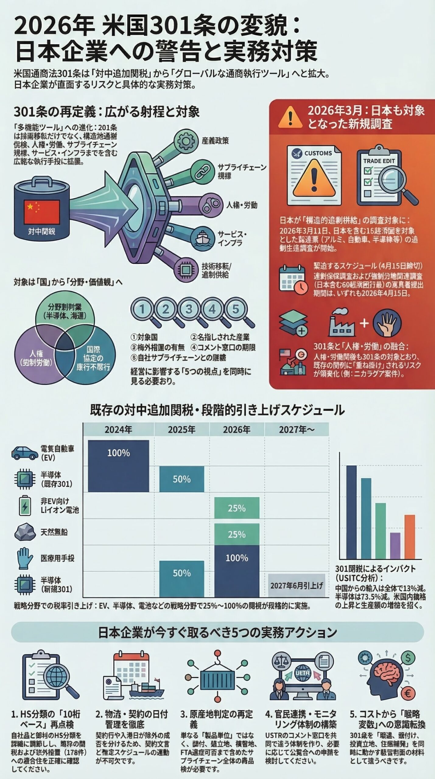 本記事は2026年3月16日時点の公開情報に基づく一般的な情報提供であり、法務、通関、税務、投資判断その他の個別助言を目的とするものではありません。実際の輸入申告、HS分類、原産地判定、契約対応、意見提出、対米輸出入戦略については、最新の公式通知と専門家の助言を必ず確認してください。2026年、日本企業が本当に見るべき今後の注視点