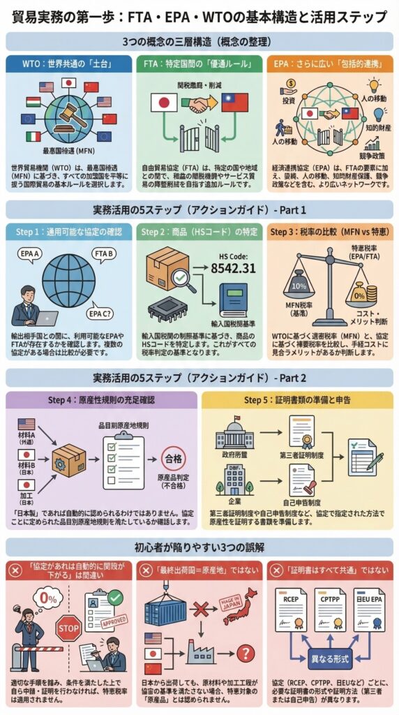 ここまでの話が単なる制度論に見えるなら、それは半分正しく、半分危険です。実務では、FTA、EPA、WTOの違いを理解していないと、「どのルールが全世界共通で」「どのルールが協定相手国だけに適用され」「どの書類が必要なのか」が混ざってしまいます。結果として、税率の確認はしたのに原産地規則を見落とした、協定はあるのに証明方法を確認していなかった、といった初歩的なミスが起きやすくなります。JETROが示すEPA利用手順が、相手国確認、HSコード特定、税率比較、原産地規則確認、証明書類作成の順になっているのは、その順番を飛ばしてはいけないからです。 (ジェトロ)