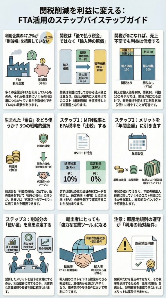 関税が下がると、会社に最初に起きる変化は、売上の増加ではなく原価の低下です。その原価低下をどう使うかによって、価格、利益率、受注条件、投資判断が変わります。だからFTAの関税メリットは、単なる税率の話ではなく、会社の数字の設計の話です。