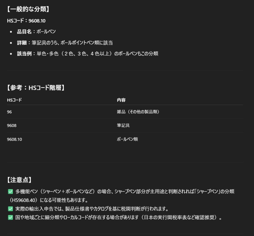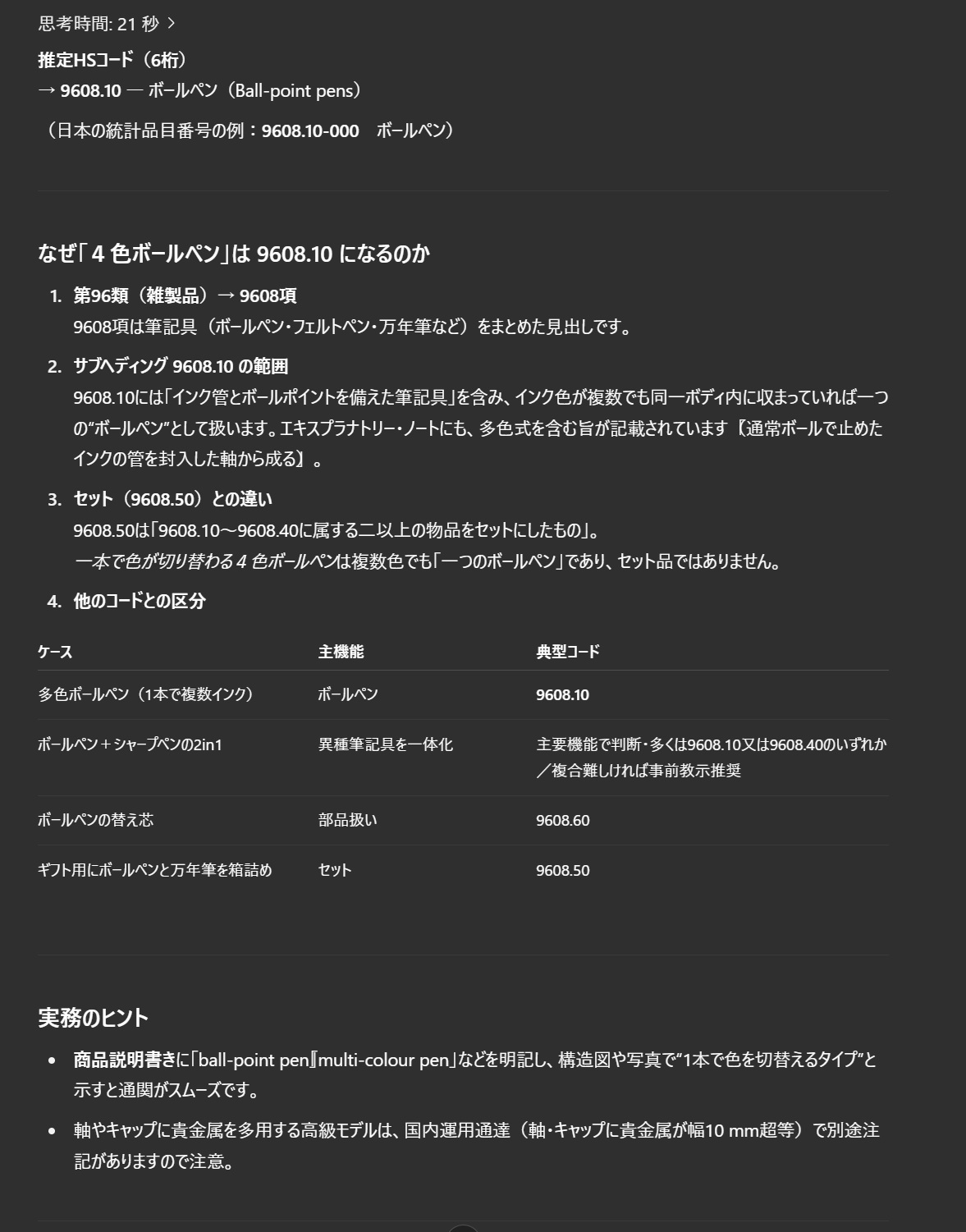 ・ 曖昧な検索から始まって、可能性のあるHSコードを提示。その妥当性もAIにより提示