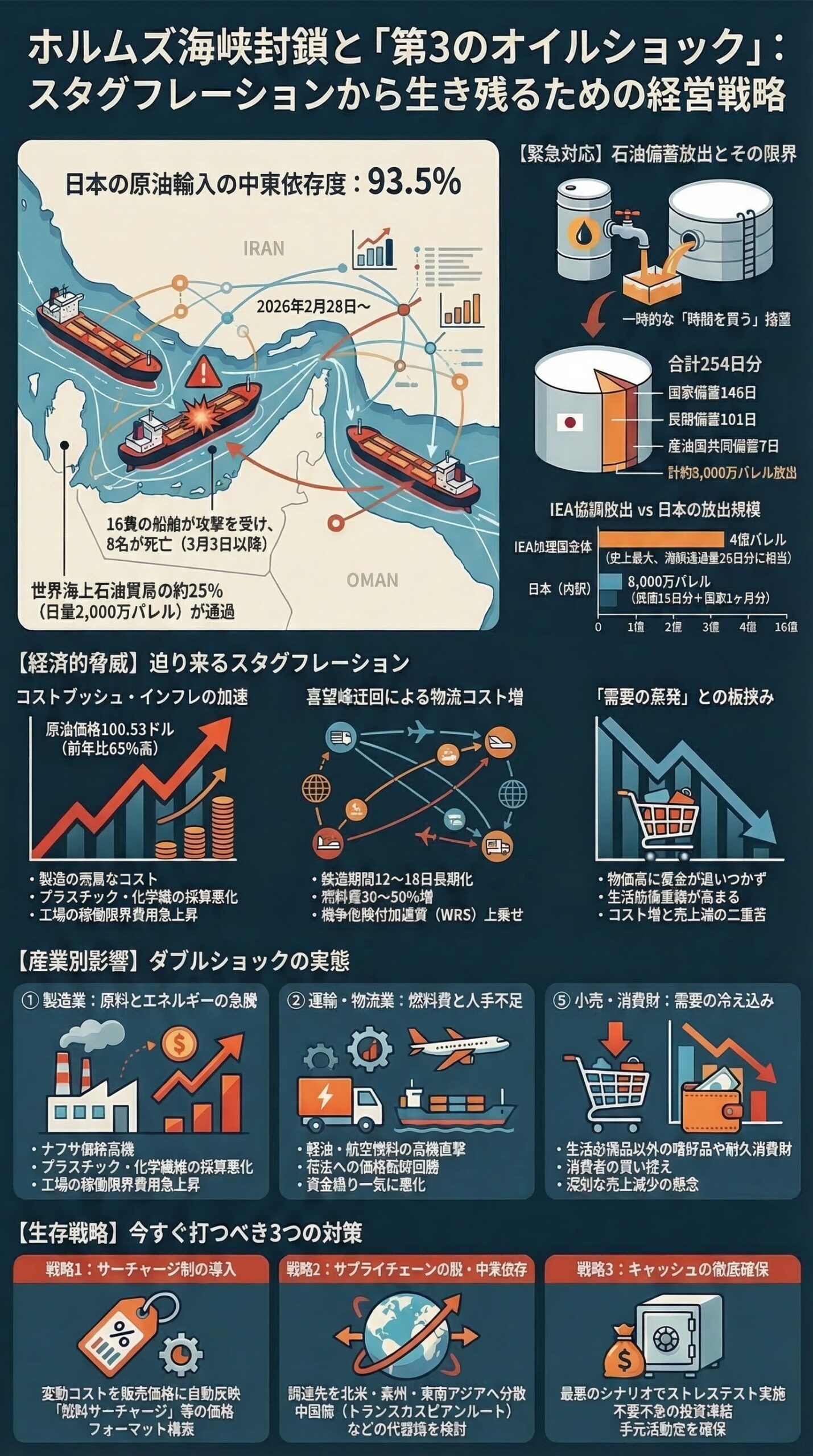 備蓄の放出は、代替調達ルートを構築し、中東の紛争を外交的に解決するための**「時間を買う」ための措置**です。企業はこの猶予期間を「事態が収束するまでの待ち時間」と錯覚してはなりません。稼いだ時間の間に自社の事業構造を変革しなければ、備蓄が底を突いた瞬間に致命傷を負うことになります。