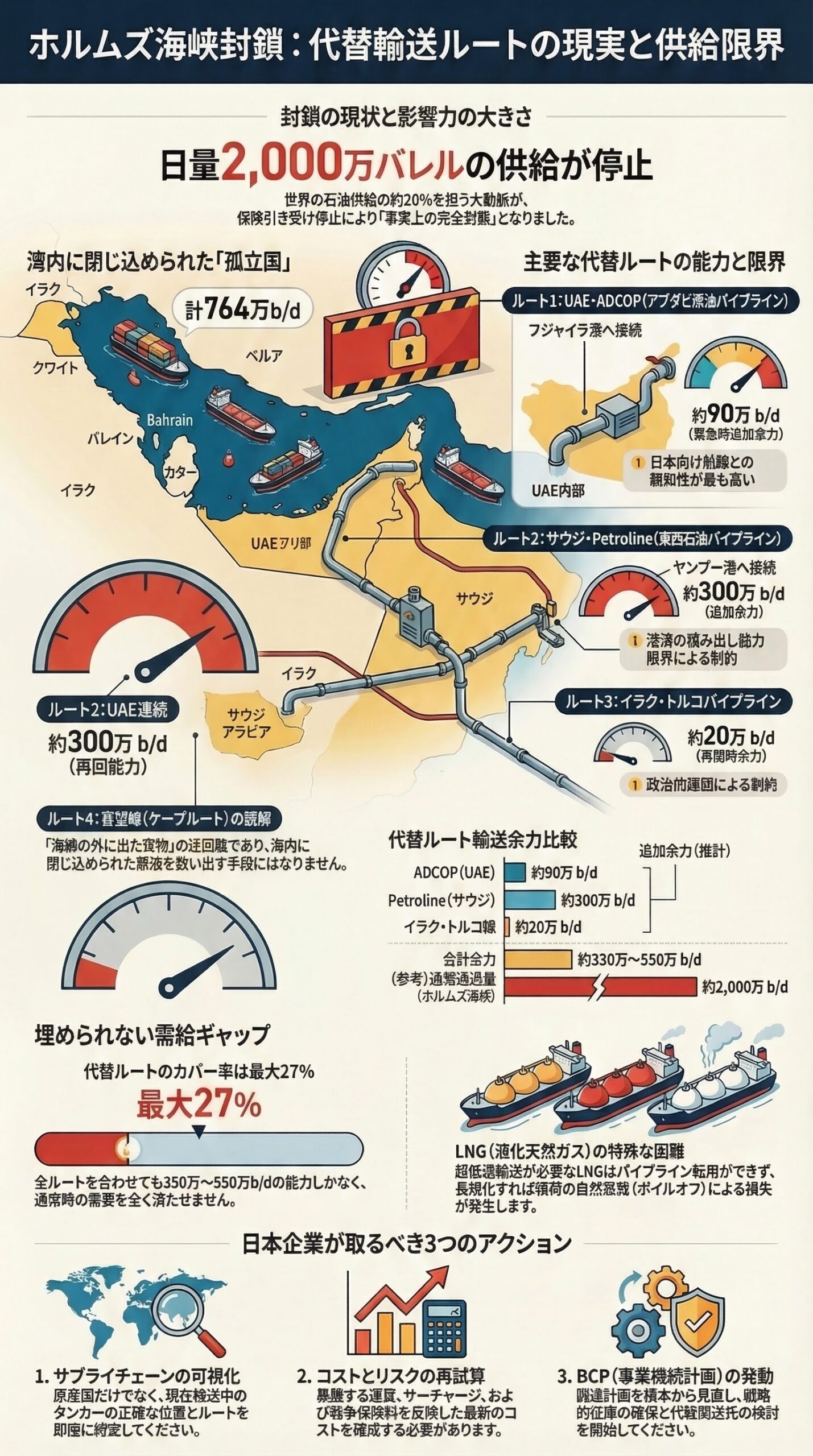 今回の危機は、「保険引き受け停止に伴う事実上の完全封鎖」と「代替能力の絶対的な不足」が組み合わさった未曾有の輸送障害である。UAEとサウジアラビアのパイプラインで世界需要の20〜27%程度を賄うのが限界であり、クウェートやカタール等の輸出は完全に停止している。