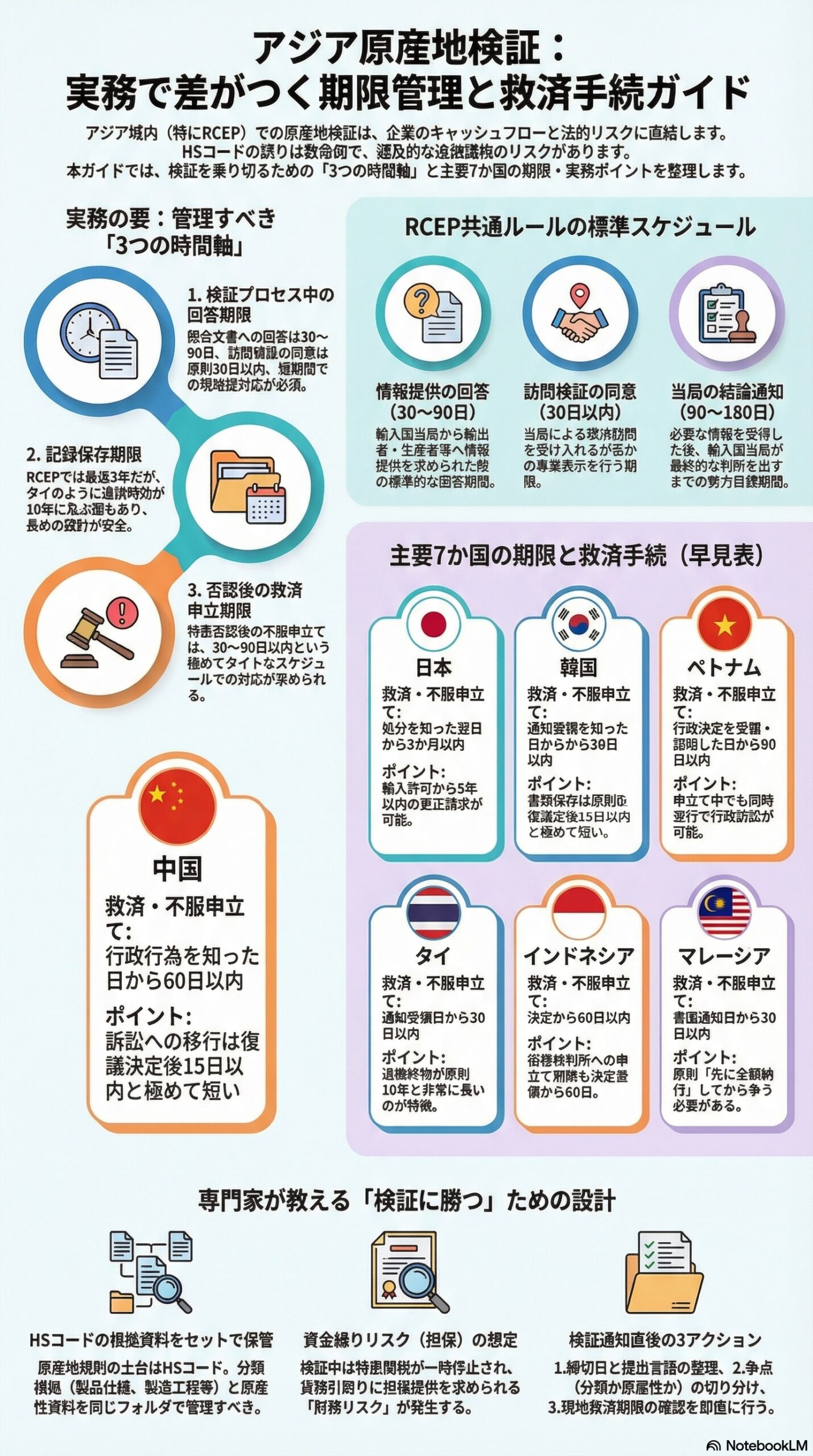 本記事では、アジア域内で利用頻度が高いRCEPの共通ルールを軸に、主要7か国(日本、韓国、中国、ベトナム、タイ、インドネシア、マレーシア)の「原産地検証の期限」と「否認されたときの救済手続」を、ビジネス実務の観点で掘り下げます。協定や国内法令は改正され得るため、最後に必ず輸入国当局の最新ガイダンスと協定本文で確認してください。