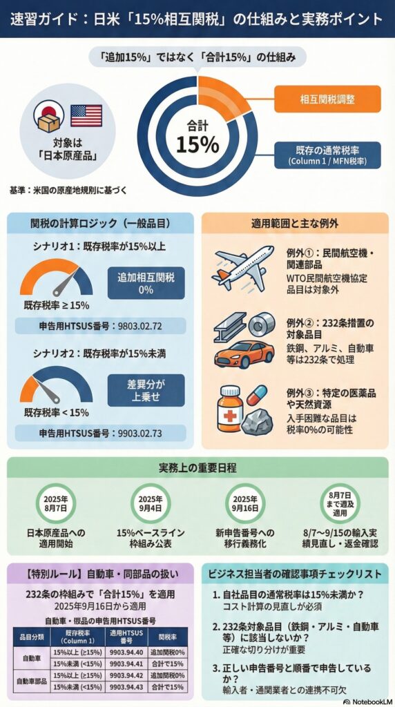輸出側(日本企業)にとっては見積もりと契約条件、輸入側(米国側の輸入者)にとっては申告実務に直撃するのが、この「15%」です。ポイントは、15%が一律上乗せではなく、原則として米国の通常税率(Column 1=MFN)を含めた合算で15%になる設計だという点です。japan.kantei+1